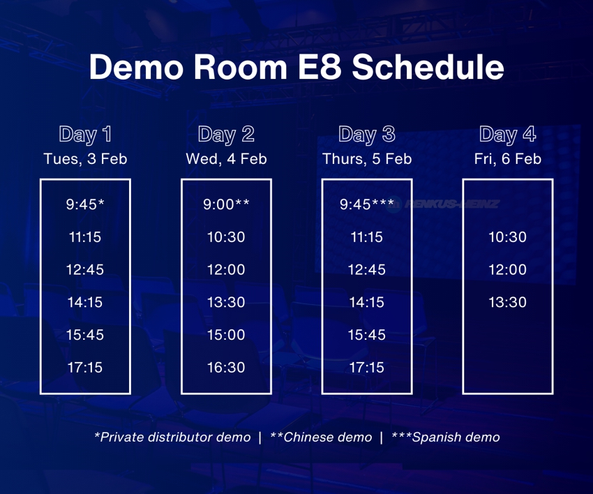 Ein Highlight werden wieder die Präsentationen im Demoraum E8 sein. Hier können Besucherinnen und Besucher erleben, wie Renkus-Heinz ein perfektes Zusammenspiel von Klang und Raum erschafft. Die Präsentationszeiten im Demoraum entnehmen Sie bitte dem „Demo Room E8 Schedule“ rechts.