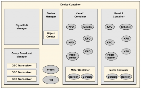 Schalter, Meter Container, RSIs, Memory Manager, Group Broadcast Manager, Signalfluß Manager und Device Manager